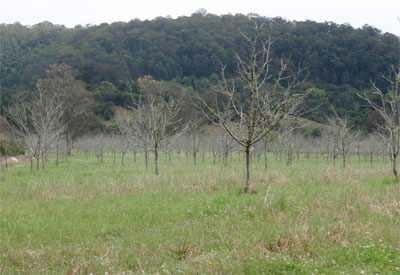 Frank employs a plethora of Permaculture techniques to achieve his growing success (excuse the pun!). He decided early on to work as a team with the earth and give back as much as he takes out. He chose to sacrifice initial quantity, for long term quality, and therefore spaces his Pecans 15m apart, allowing for greater root development and less nutrient robbing. He protects his precious soil with nitrogen fixing ground covers such as Vetch and Clover, letting it grow up to a metre, only cutting for nut harvest, mulching to spread clippings as green manure instead of slashing and never cutting below 10cm for root development. He spreads composted chicken manure from his chooks annually to replenish nutrients after being horrified at the soil burning and hardening effects of Urea. He also grows a diversity of Pecan varieties. This allows cross pollination and protection in the case of low yields from one variety.